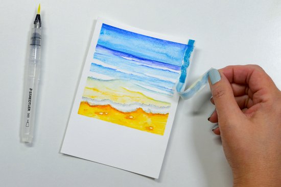 8. Ezután hagyjunk mindent alaposan megszáradni, és óvatosan távolítsuk el a festőszalagot a papírról.