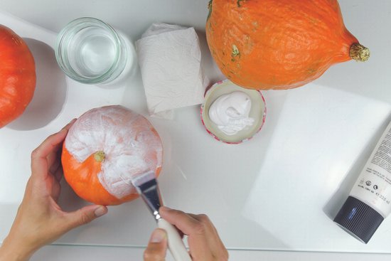 1. Mielőtt a fehér alaplakkot felvinnénk a tökökre, tisztítsuk meg őket konyhai szivaccsal és szappannal, majd alaposan szárítsuk meg őket. Ez segít abban, hogy az akrilfesték jobban megtapadjon rajtuk. Nyomjunk egy kis festéket a palettára, majd a széles, száraz ecsettel vigyük fel a fehér festéket mindegyik tök felső felére. Hagyjuk megszáradni, majd fessük meg az alsó felét. Ha az egész tök megszáradt, vigyünk fel egy újabb réteg fehér festéket. Ezután hagyjuk az egészet teljesen megszáradni!