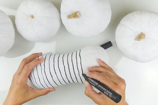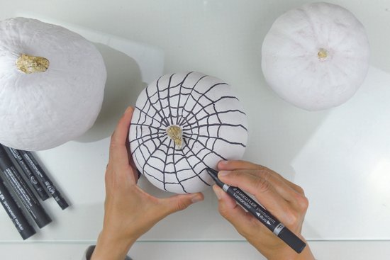 3. Ha pókhálós mintát szeretnénk létrehozni a tökön, a Lumocolor alkoholos markerrel húzzunk egy függőleges vonalat minden egyes részen, esetleg néhány plusz vonalat is hozzáadva a két vonal között. Ezután rajzoljunk ívelt vízszintes vonalakat, amelyek összekötik az összes függőleges vonalat. Variáljuk bátran, hogy saját izgalmas mintákat hozzunk létre.