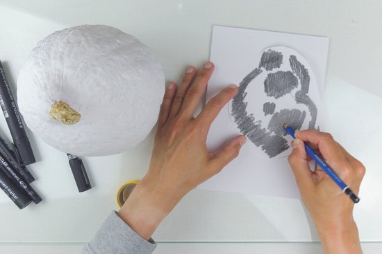 4. A puha Lumograph 4B ceruzával másoljunk, rajzoljunk, vagy vázoljunk fel előre minden olyan mintát vagy feliratot, amelyet nem szabadkézzel fogunk a töklámpásra rajzolni. Ezután vágjuk körbe a sablonját, fordítsuk meg és árnyékoljuk át a minta hátoldalát a ceruzával. A minta innen tölthető le.