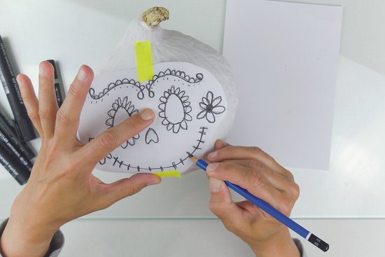 5. Helyezzük a sablont a sütőtökre, és ha szükséges, rögzítsük is, hogy ne csússzon el. Most rajzoljuk át a mintát, majd vegyük le a sablont.