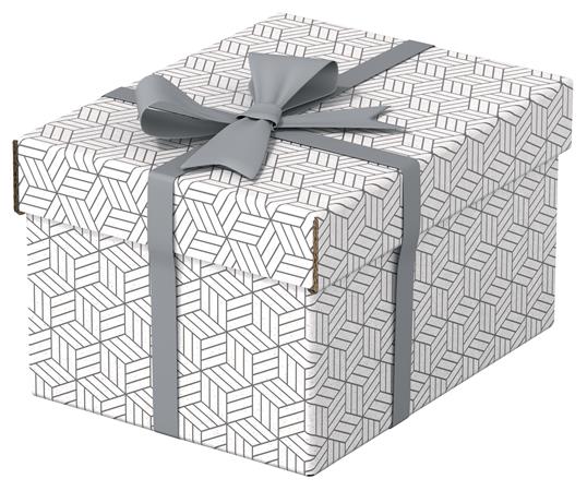 Stílusos és modern karton tárolódobozok levehető tetővel ajándékok csomagolásához vagy otthoni tároláshoz. Három azonos méretű doboz, amelyeket önállóan vagy polcokra helyezve használhat kisebb tárgyak, például fényképek és személyes dokumentumok rendezett tárolásához. Kösse át egy szalaggal és használja ajándék csomagolásához!