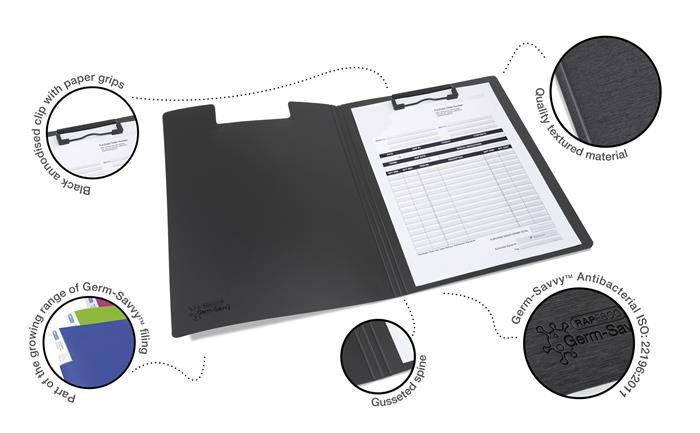 A RAPESCO Germ-Savvy® fedeles felírótáblája anitbakteriális bevonattal készült, mely a baktériumok 99%-át elpusztítja.