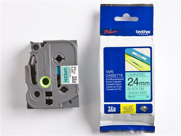 Feliratozógép szalag, 24 mm x 8 m, BROTHER, "TZe-751" zöld-fekete
